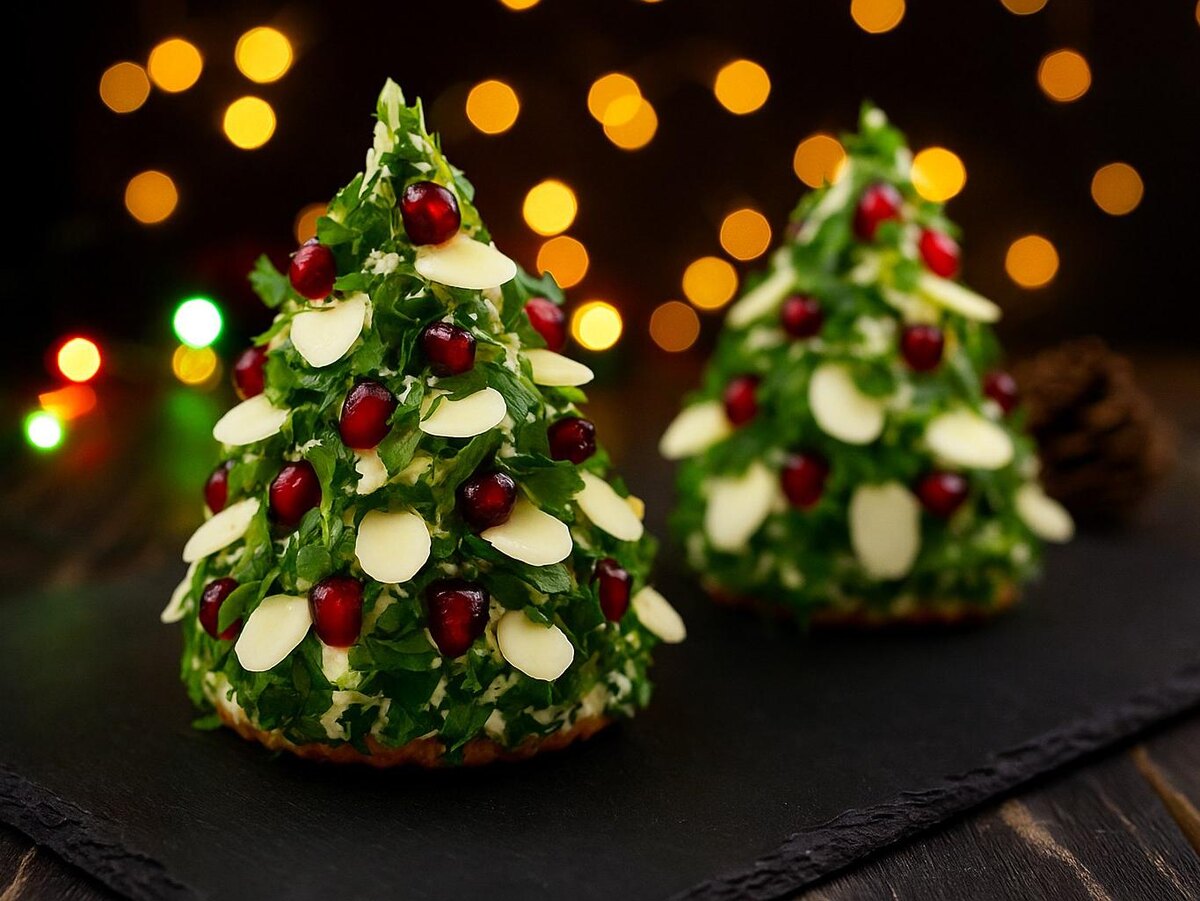 Обваляйте каждую сырную заготовку в нарезанной петрушке. Затем используя семена граната и миндальные лепестки, украсьте свои "елочки". Это создаст чудесный праздник на вашем столе.
