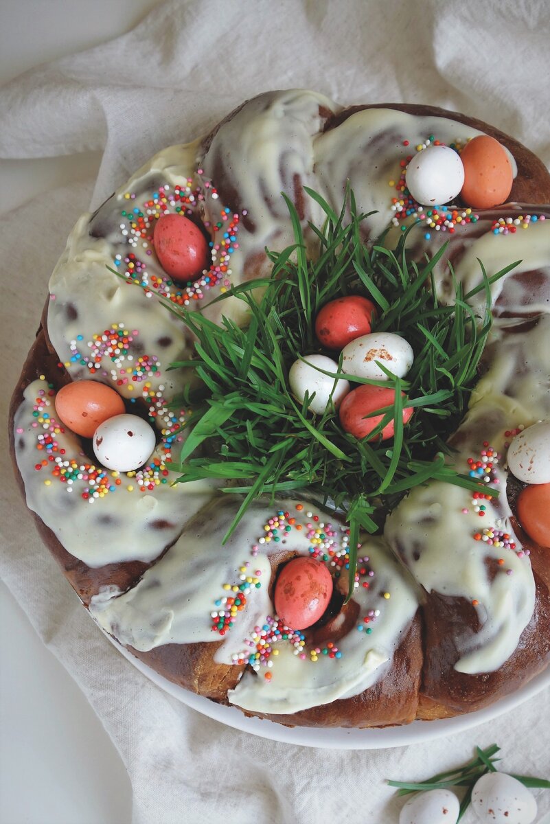 7. Украшение: остывший венок покрыть глазурью и посыпать яркой посыпкой. В завершение установить декоративные яйца в выпеченные выемки.